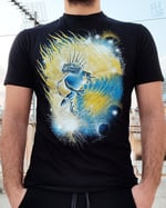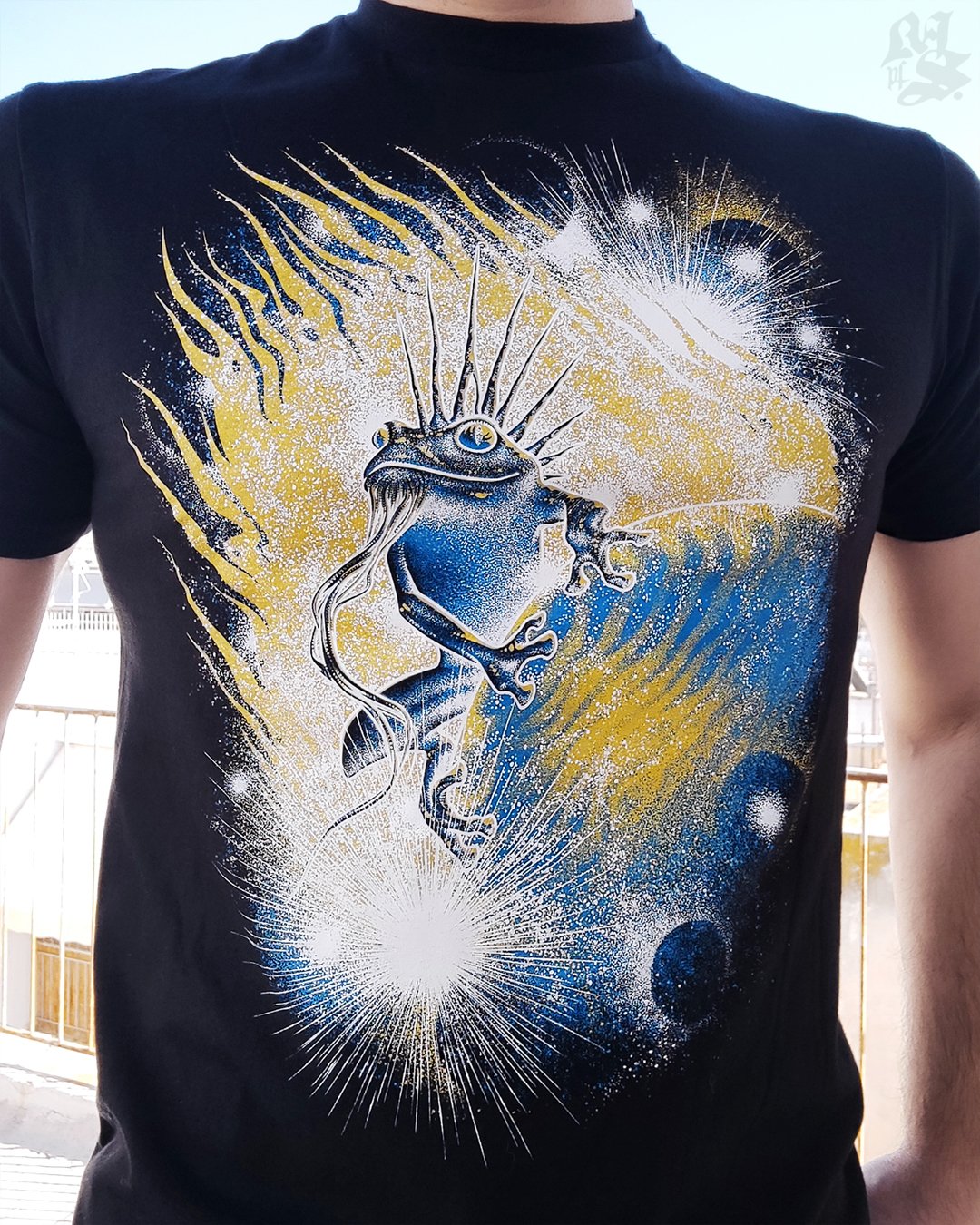 Silk screen printed with blue, yellow & white inks on 183gsm black Gildan Softstyle Midweight t-shirts, 100% ring spun cotton, hand pulled by the little furry critters at Inkspit Rats.