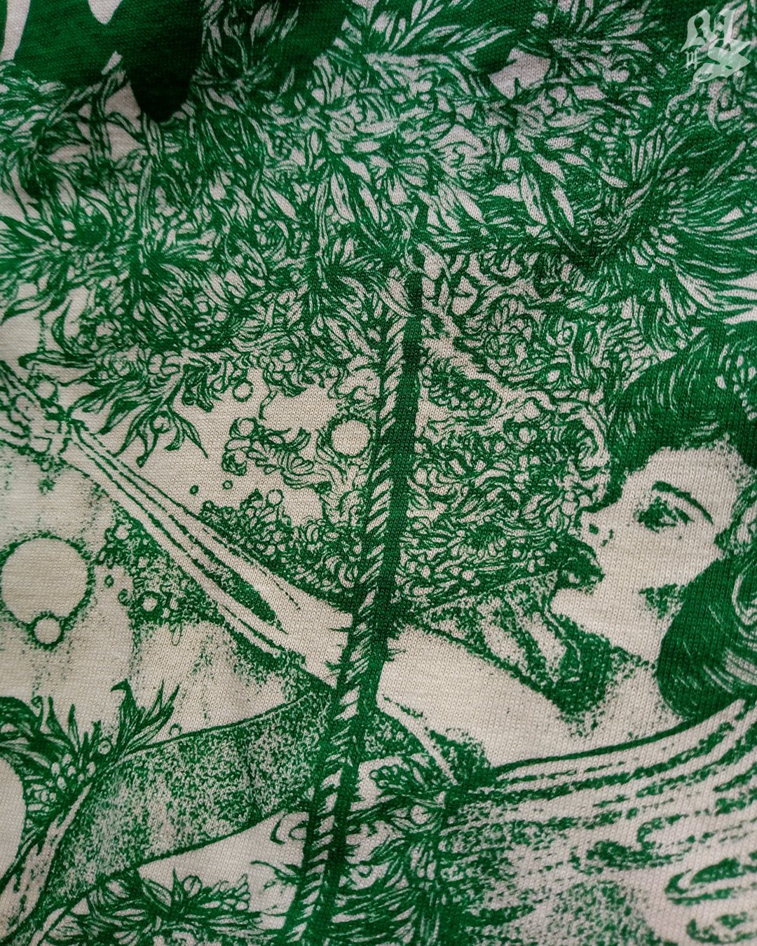 Silk screen printed with green inks on 153gsm sand Gildan Softstyle Ring Spun t-shirts, 100% cotton, ring spun & preshrunk, hand pulled by the little furry critters at Inkspit Rats.