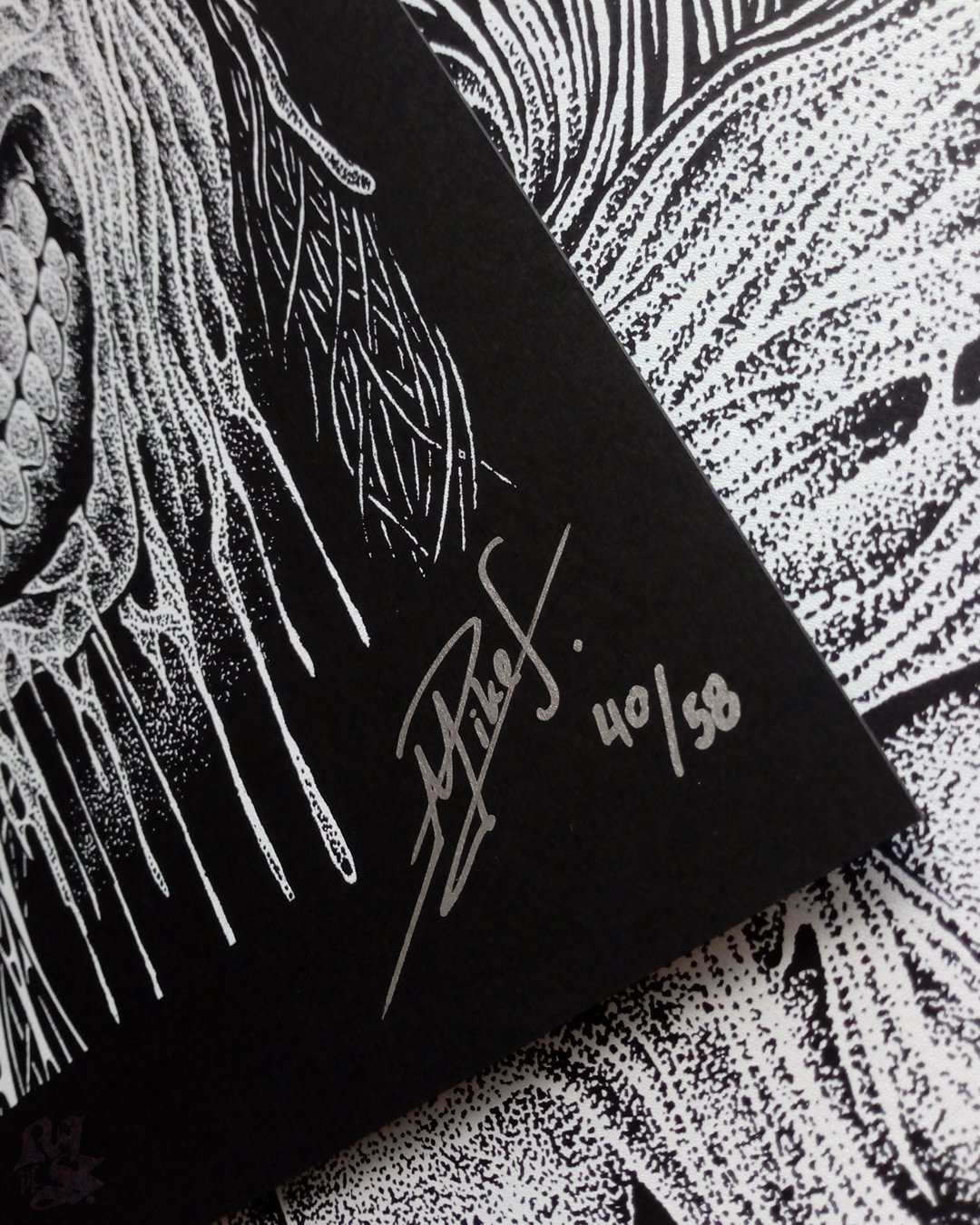 Silk screen printed with white inks on 320gsm Papago black paper, hand pulled by the little furry critters at Inkspit Rats.