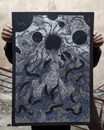 Silk screen printed with dark blue and metallic silver inks on 250gsm Rives Tradition Le Noir uncoated black paper, hand pulled by the lovely lads at Fuzz Ink..